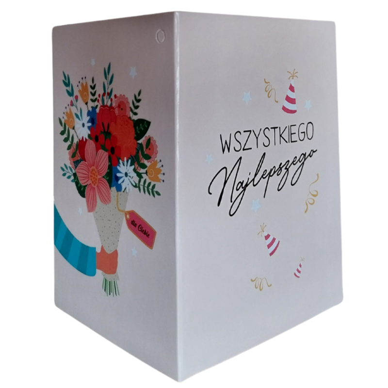 Dodaj ciepłe życzenia do bukietu bilecikiem z napisem „Wszystkiego najlepszego”! Standardowy biały bilecik dołączamy bezpłatnie.