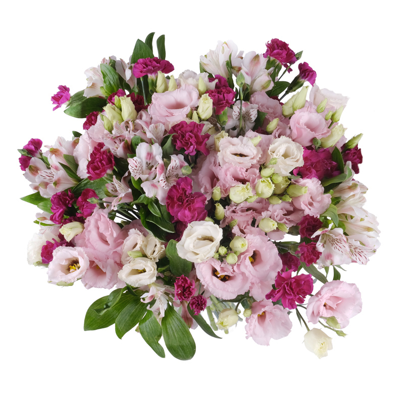 Bukiet „Miłosny list” to wyrazisty miks eustomy, alstromerii i goździka, które w różowych odcieniach z intensywniejszymi akcentami tworzą prawdziwie romantyczną kompozycję.